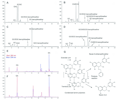 本研究探究了不同红树植物单宁的结构及其抗氧化活性关系,并进一步分析不同单宁对红树林沉积物微生物的影响作用。该研究以中国常见的三种红树林植物:秋茄(Kandelia obovata)、桐花树(Aegiceras corniculatum)和无瓣海桑(Sonneratia apetala)作为研究对象,利用基质辅助激光解析电离飞行时间质谱(MALDI-TOF MS)以及高效液相色谱电喷雾电离质谱(HPLC-ESI-MS)等技术,对叶片中的单宁结构进行了深入分析。研究发现,秋茄和桐花树富含缩合单宁(CT),其主要结构单元分别为原花青素(PC)和原儿茶素(PD),而无瓣海桑则以水解单宁(HT)为主的复杂单宁,水解单宁其主要结构单元为没食子酸(GA)和棓酸(EA)。