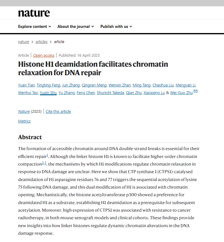 2025年4月16日,vsport医学部基础医学院及卡尔森国际肿瘤中心朱卫国教授团队在《自然》(Nature)杂志在线发表了题为“Histone H1 deamidation facilitates chromatin relaxation for DNA repair” 的研究论文,揭示了连接组蛋白H1脱酰胺化修饰(deamidation)促进染色质开放和DNA损伤修复的机制,为肿瘤放化疗的精准靶标设计夯实了理论基础,在肿瘤防治基础研究领域取得突破性进展。