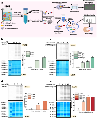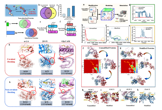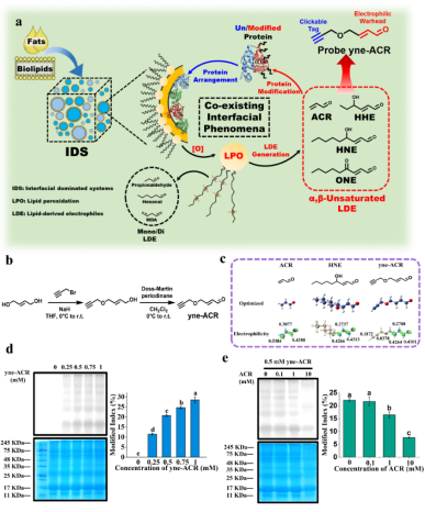 为验证上述猜想,研究团队以亲电能力最强的α,β-不饱和醛为骨架,设计合成了带有可点击标签的探针yne-ACR,模拟LDEs对蛋白的修饰作用。借助乳清蛋白-十六烷组成的水-油界面模拟体系,结合界面流体力学、化学蛋白质组学以及全原子分子动力学模拟等技术,系统解析了界面上LDEs对乳清蛋白的修饰作用及其界面行为的影响。实验结果表明,LDEs对界面蛋白具有更显著的修饰作用,被修饰蛋白在界面排布的稳定性下降,可在后续的剪切过程中脱离界面并在体相中形成蛋白聚集体。以上研究发现可为进一步理解界面在生物体内或食品加工过程中的重要作用提供新的视角。