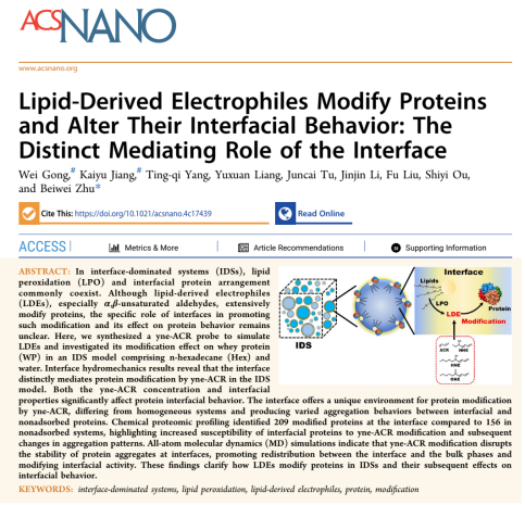 Gong W, Jiang K, Yang T-Q, et al. Lipid-Derived Electrophiles Modify Proteins and Alter Their Interfacial Behavior: The Distinct Mediating Role of the Interface [J]. ACS Nano, 2025, DOI: 10.1021/acsnano.4c17439