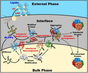 界面广泛存在于生物体和各类食品中,各类界面(如液-液界面、气-液界面等)的存在对生命活动的正常进行或食品品质的稳定维持具有重要意义。无论对于生物体还是食品,蛋白质不仅作为物质基础直接参与界面的组成,也可通过向界面的扩散、吸附以及重排等一系列界面行为来行使其稳定界面的功能。另一方面,脂质过氧化(LPO)是生命活动和食品加工中最常见也备受关注的生化进程。在活性氧的作用下,脂质中的多不饱和脂肪酸可逐渐裂解形成各种脂质衍生亲电体(LDEs),这些LDEs可对蛋白质中的亲核残基,如赖氨酸、半胱氨酸和组氨酸进行共价修饰,从而造成蛋白功能紊乱或食品品质下降。值得注意的是,在水-油界面体系中,LPO同样被视为一种界面现象,因此作者们推测界面可能为LDEs对蛋白质的修饰作用提供独特的微环境,从而引起蛋白界面行为的改变。
