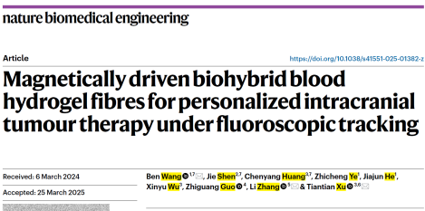 论文信息:Ben Wang†*, Jie Shen†, Chenyang Huang†, Zhicheng Ye, Jiajun He, Xinyu Wu, Zhiguang Guo, Li Zhang*, Tiantian Xu*, Magnetically-driven biohybrid blood hydrogel fibres for personalized intracranial tumour therapy under fluoroscopic tracking.Nature Biomedical Engineering2025, DOI: 10.1038/s41551-025-01382-z.