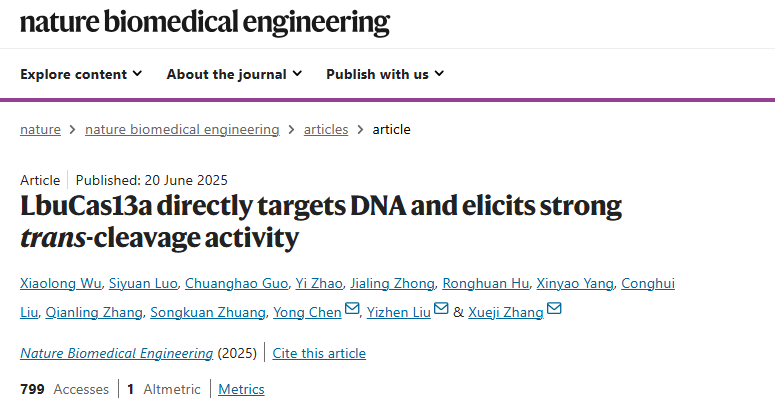 近日,vsport化学与环境工程学院副教授刘翼振和教授张学记在 CRISPR 基因诊断技术领域取得突破性进展,为临床精准诊断提供了创新技术方案。相关成果以“LbuCas13a directly targets DNA and elicits strong trans-cleavage activity”(LbuCas13a 直接靶向 DNA 并引发强反式切割活性)为题发表于国际顶尖学术期刊《自然・生物医学工程》(Nature Biomedical Engineering)(影响因子:26.6)。刘翼振指导的2022级化学专业硕士生吴小龙和骆思源为第一作者,副研究员陈勇、刘翼振、张学记为通讯作者,vsport为唯一作者单位。
