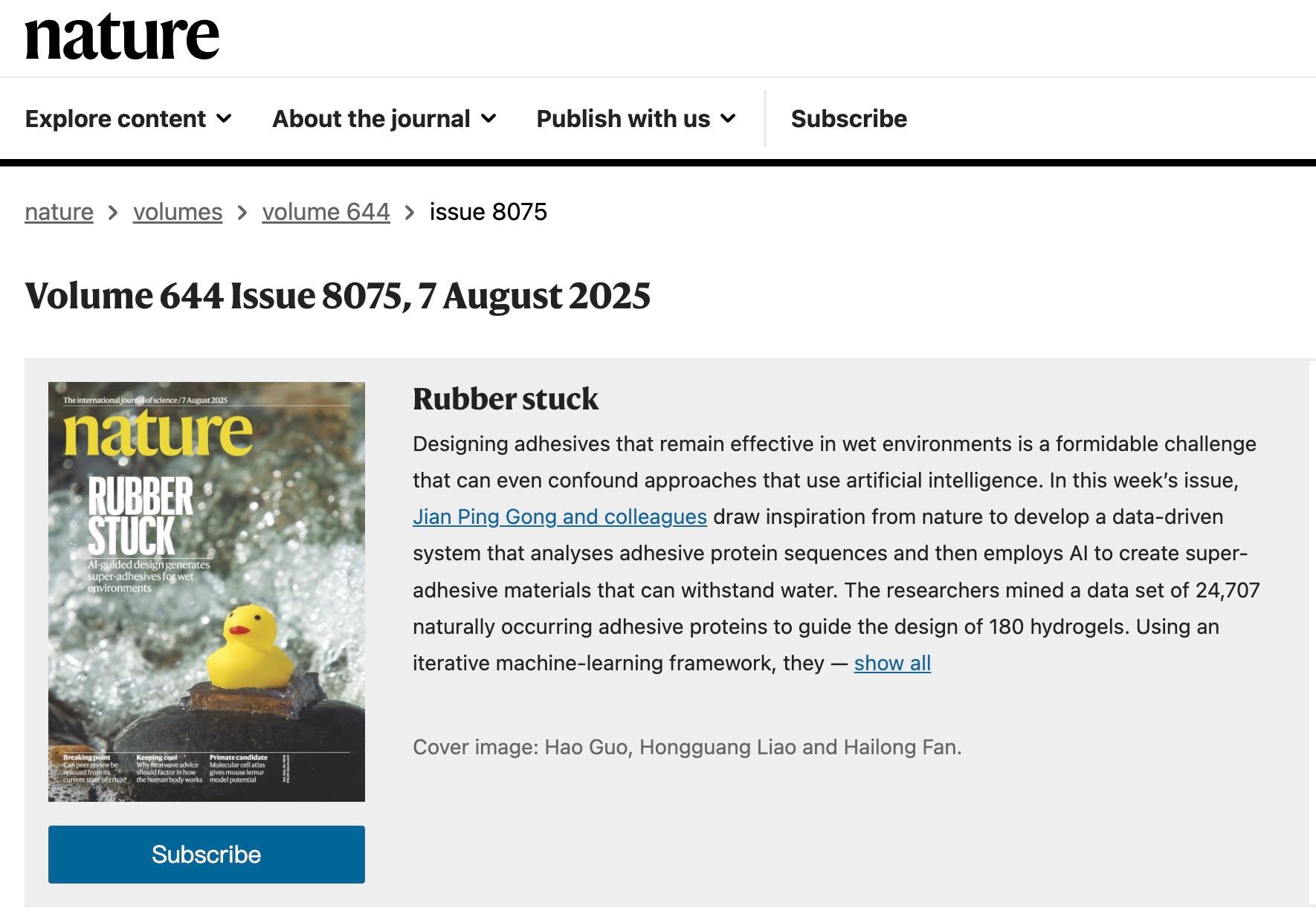 近日,vsport化学与环境工程学院特聘副教授范海龙联合北海道大学教授龚剑萍等人在水凝胶领域取得重要突破。他们基于蛋白质数据库,创新性地提出了一种融合数据挖掘、仿生实验设计与机器学习的“三位一体”设计策略,成功预测并开发了水下粘附强度达到兆帕(MPa)级的超粘水凝胶。这一成果展示了一个从“仿生经验”走向“数据驱动”的完整材料设计路径。该成果发表于国际顶级学术期刊《自然》(Nature),并被选为当期封面。范海龙为通讯作者之一。