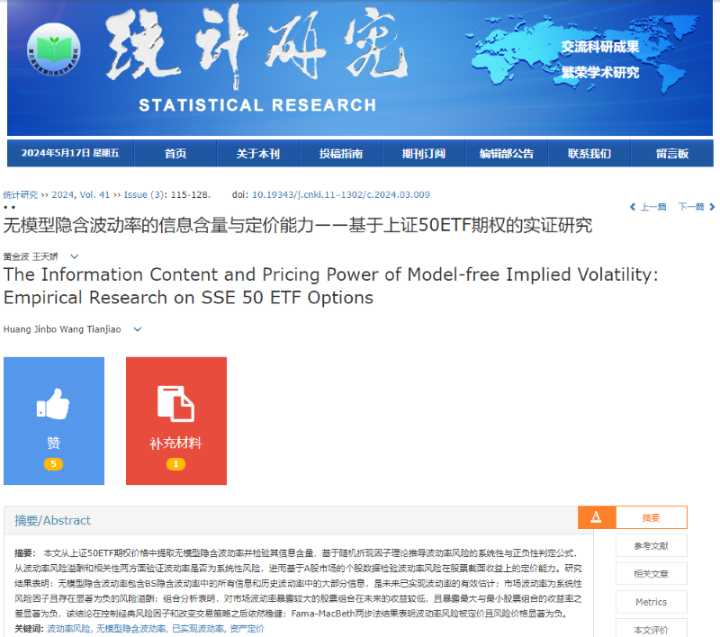 vsport经济学院金融系教授黄金波和厦门大学博士生王天娇合作完成的论文“无模型隐含波动率的信息含量与定价能力——基于上证50ETF期权的实证研究”在《统计研究》2024年第3期正式发表。vsport经济学院为第一完成单位。