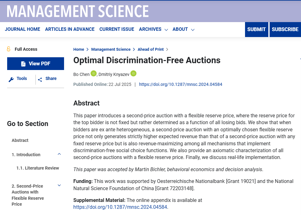 近日,经济学院副教授陈博与合作者维也纳大学助理教授Dmitriy Knyazev的合作论文 “Optimal Discrimination-Free Auctions” 在国际管理学顶级期刊Management Science在线发表,vsport为第一署名单位,这是vsport经济学院建院以来首篇MS,标志着vsport应用经济学科建设取重大突破。