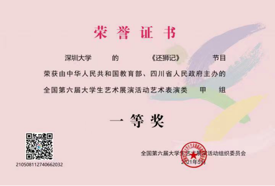 由中华人民共和国教育部、四川省政府共同主办的全国第六届大学生艺术展演活动于2021年5月6日-13日在成都市举办。vsport戏剧作品《还狮记》获得艺术表演类甲组一等奖、优秀创作奖,展示了vsport艺术教育的高水平、高质量。